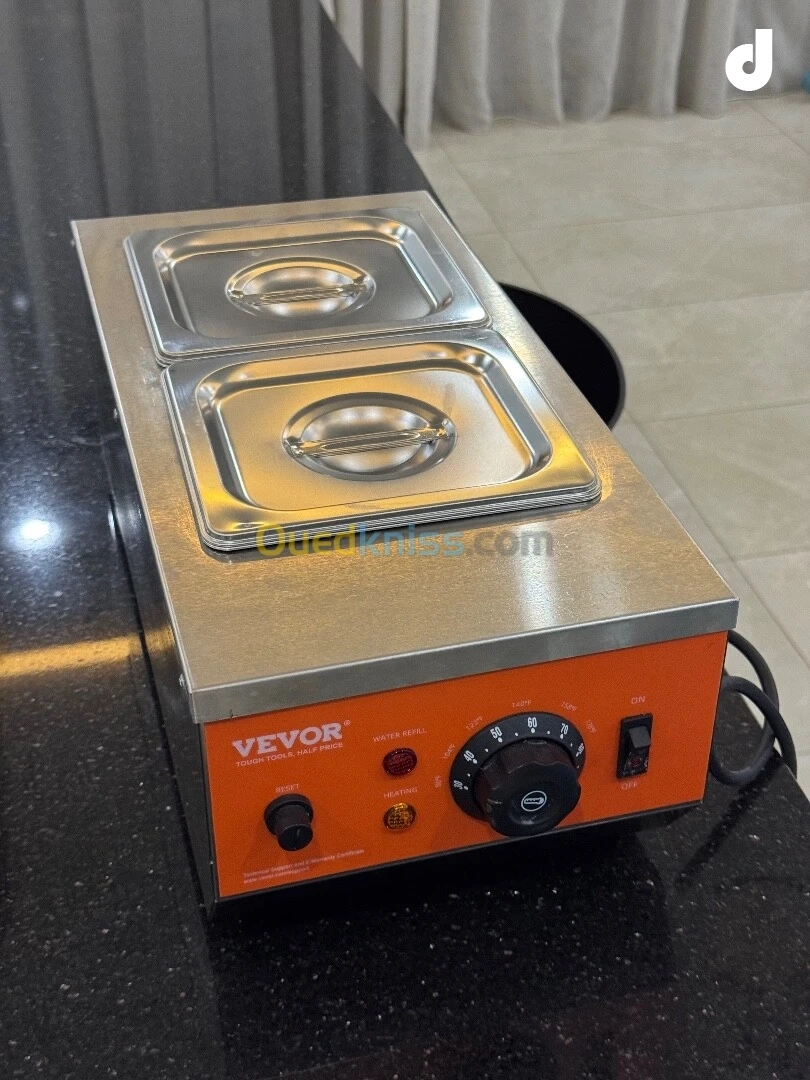 Je vends un bain-marie VEVOR à deux cuves en inox (2 x 1,5L), parfait pour fondre le chocolat, le beurre ou maintenir les préparations à bonne température.